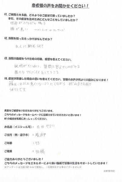 右膝の痛みで整形外科に通っていましたが、なかなか改善されずウェブで検索していたところ浜野整骨院を見つけ来院しました。