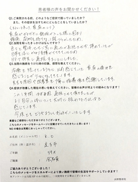 治療を続けているうちに、以前感じていた首・肩の痛みを感じることが少なくなってきています。先生も原因や改善策を丁寧に指導していただき感謝しています。