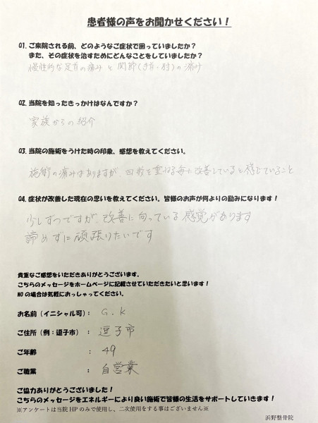 施術の痛みはありますが、回数を重ねていくたびに改善していると感じます。少しずつですが改善に向かっている感覚があります。これからも諦めずに頑張りたいです。